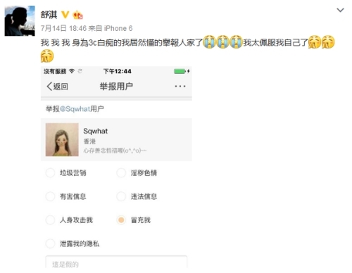 据悉,这位“假舒淇”已经不只一次冒充舒淇,还假装舒淇口吻发微博,举报之后这位“假舒淇”也立刻删掉所有状态。