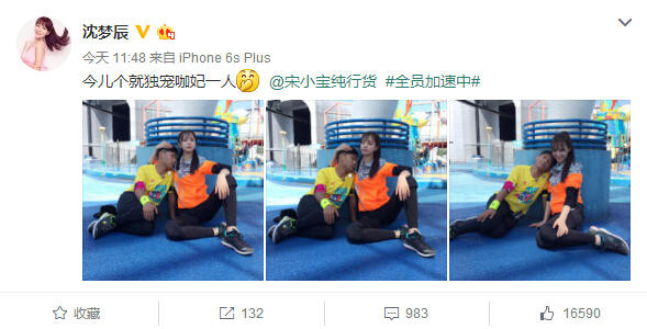 7月15日中午,沈梦辰在微博放出与宋小宝参加综艺节目的合照,其中宋小宝依偎在沈梦辰的肩头,而沈梦辰则霸气十足,画面十分搞笑。